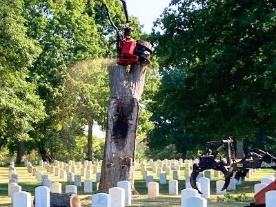 Volunteers at the September 17 Saluting Branches 25 effort in Marion, Indiana trimmed and removed trees at the national cemetery that were endangering headstones and putting the public's safety at risk.