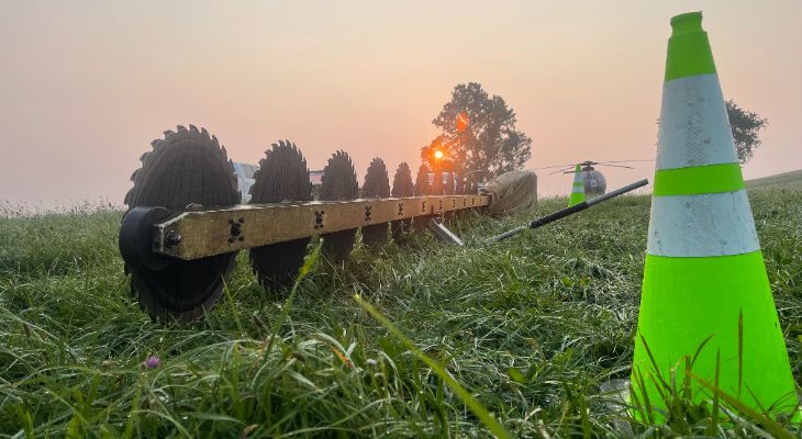 The work is routine maintenance to remove overhanging or encroaching branches that can interfere with reliable energy delivery. I&M is contracting with Roto Blade to perform the work using a helicopter-based saw. The saw is suspended beneath a helicopter by a vertical boom with multiple blades attached. Aerial trimming is faster and can more easily reach off-road areas than traditional trimming.